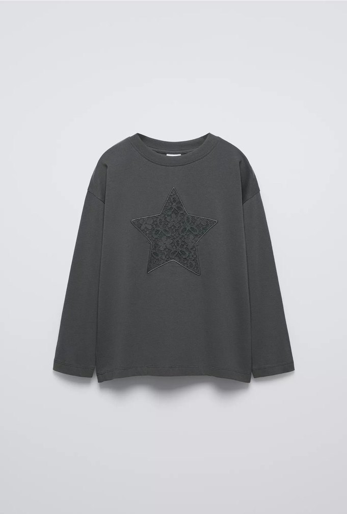 Gri renkli kız çocuk tişörtü, uzun kollu ve yuvarlak yaka. Payetli baskılı yıldız deseniyle, yumuşak ve sıcak kumaştan üretilmiştir. ⭐