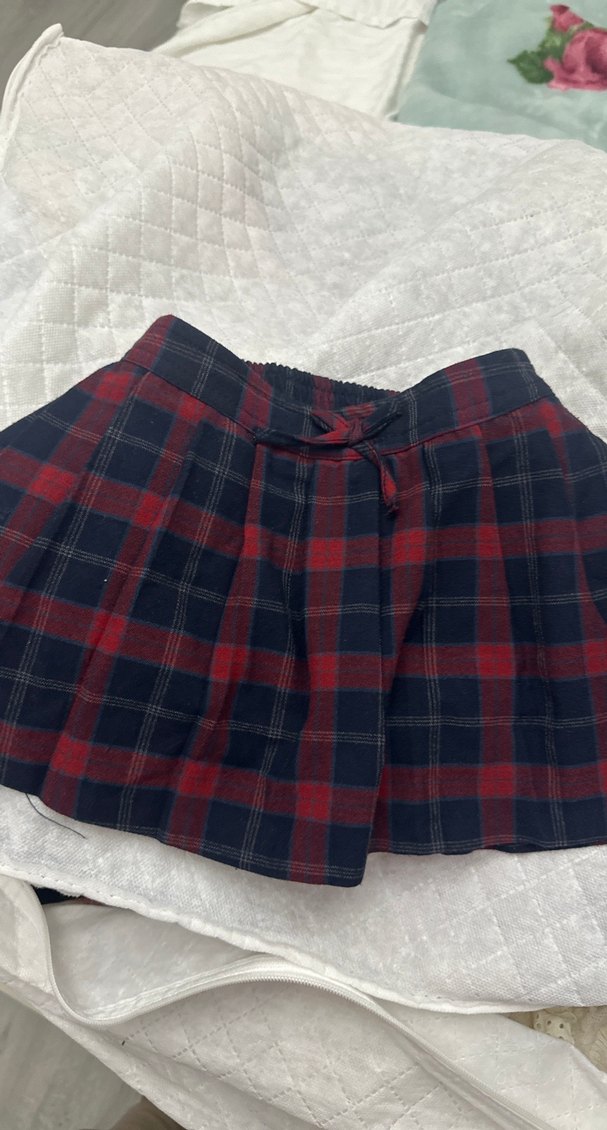 3 yaş Lacivert ve kırmızı ekoseli, pileli ve bol kesim mini etek. Yumuşak kumaştan, dış mekan kullanımı için uygun.