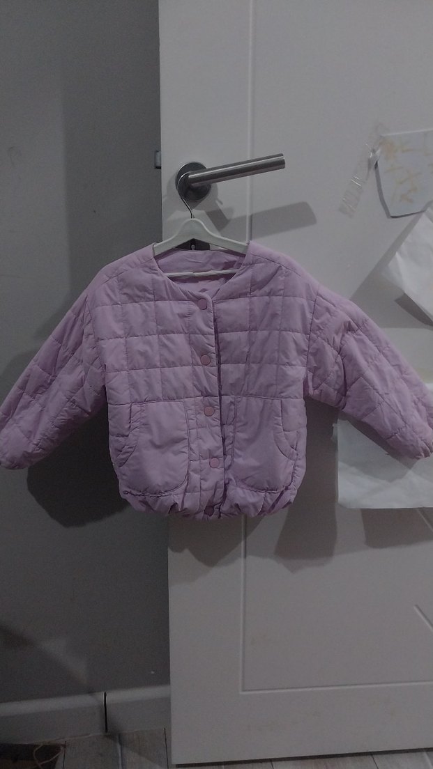 Pastel mor-lila renkte, düğmeli, yuvarlak yakalı ve uzun kollu kısa, bol kesim kiz cocuk montu. Yumuşak ve rahat kumaştan üretilmiştir, günlük kullanıma uygundur. ince kumas baharlik.