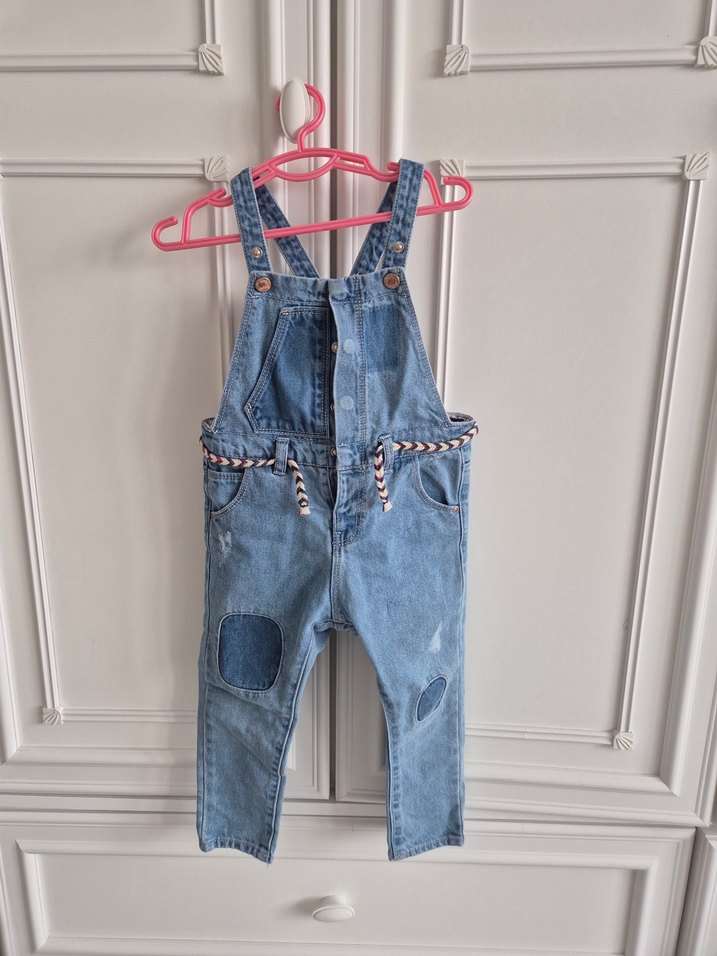 Ayarlanabilir tokalı askılara ve yama detaylarına sahip, bol kesim mavi denim kız tulumu, ön ceplerle birlikte. Kalem lekesi var, inceleyerek alım yapınız.