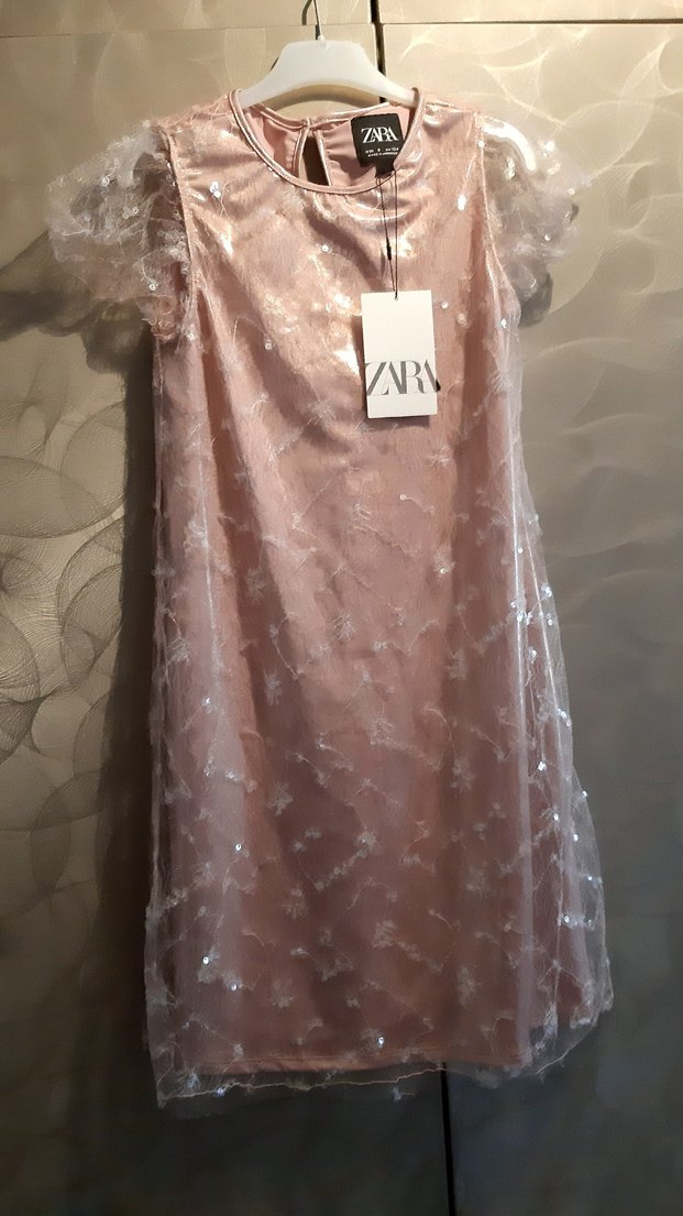 Zara kız çocuk elbisesi, straplez yaka ve kısa kolludur. Pastel pembe renkli, baskılı ve drapeli tasarıma sahip, yumuşak sentetik kumaştan yapılmıştır. ✨