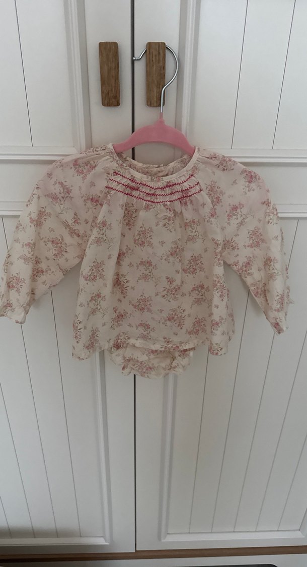 Uzun kollu, bol kesim ve V yaka dantelli kız çocuk bluzu. Pamuk kumaştan, vintage tarzda pastel pembe çiçekli desenlidir.