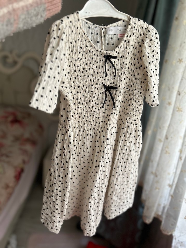 Kısa kollu, bisiklet yakalı, beyaz üzerine siyah puantiyeli, bol kesim kız çocuk elbisesi. Fırfır detayları ve siyah fiyonklarla tamamlanmıştır. Zara 6 yaş elbise. Tertemiz yeniden farkı yoktur.