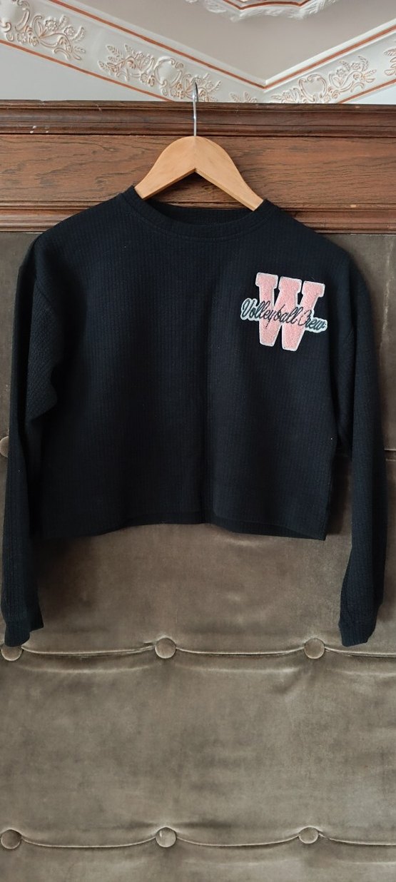 Siyah renkli, triko dokulu kız çocuk kazak, uzun kollu ve yuvarlak yakalıdır. Göğüs kısmında baskılı deseni vardır, rahat ve trend sokak stili için uygundur. Orjinal temiz sorunsuz.