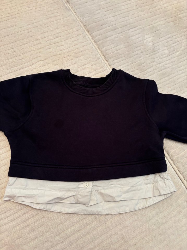 Lacivert, yuvarlak yaka, uzun kollu ve bol kesim pamuklu sweatshirt. Biraz göbek boyunda. Gömlek şeklinde etek ucu detayıyla şık bir sokak stili sunar. Günlük kullanım için uygundur.