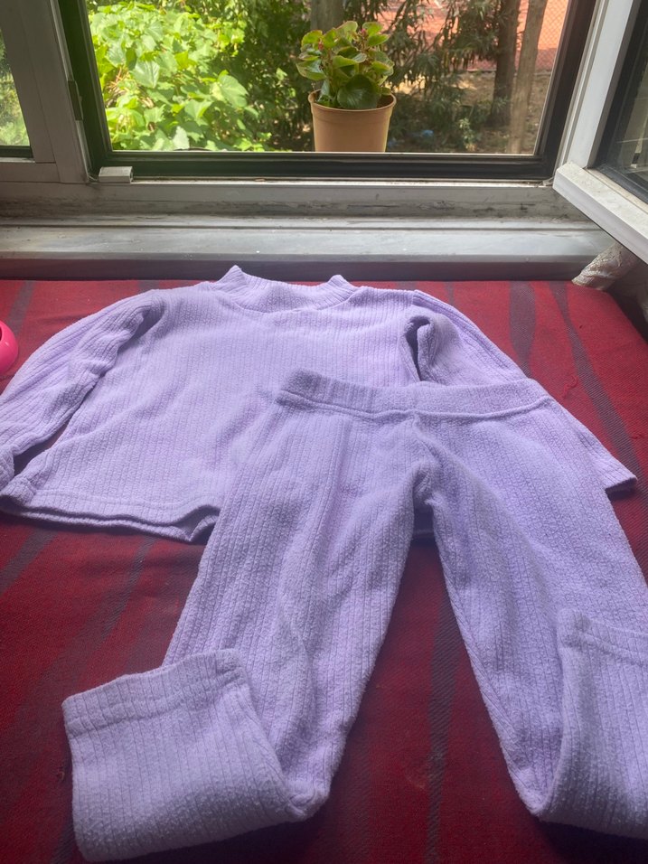 Orjinal zara Mor pastel renkte, triko dokulu, bol kesim kız eşofman takımı. Uzun kollu ve yuvarlak yakalı, rahat bir sokak stili sunar.