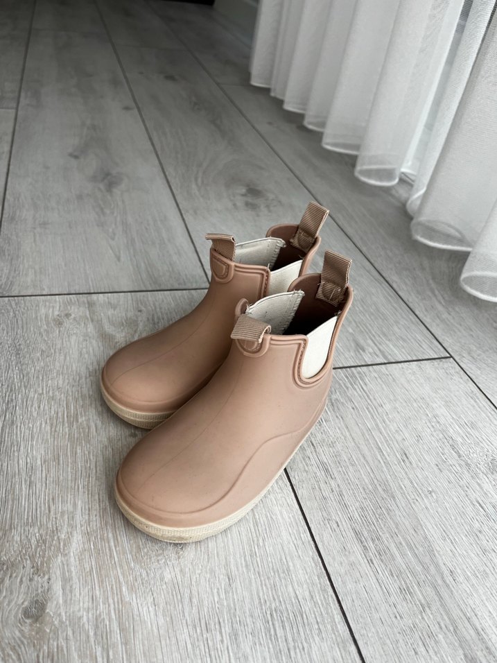 Bej renkli, lastik malzemeden yapılmış kız çocuk botları, pastel tonlarda ve desen olmadan sade bir şıklık sunar. Hiçnir kusuru yoktur.