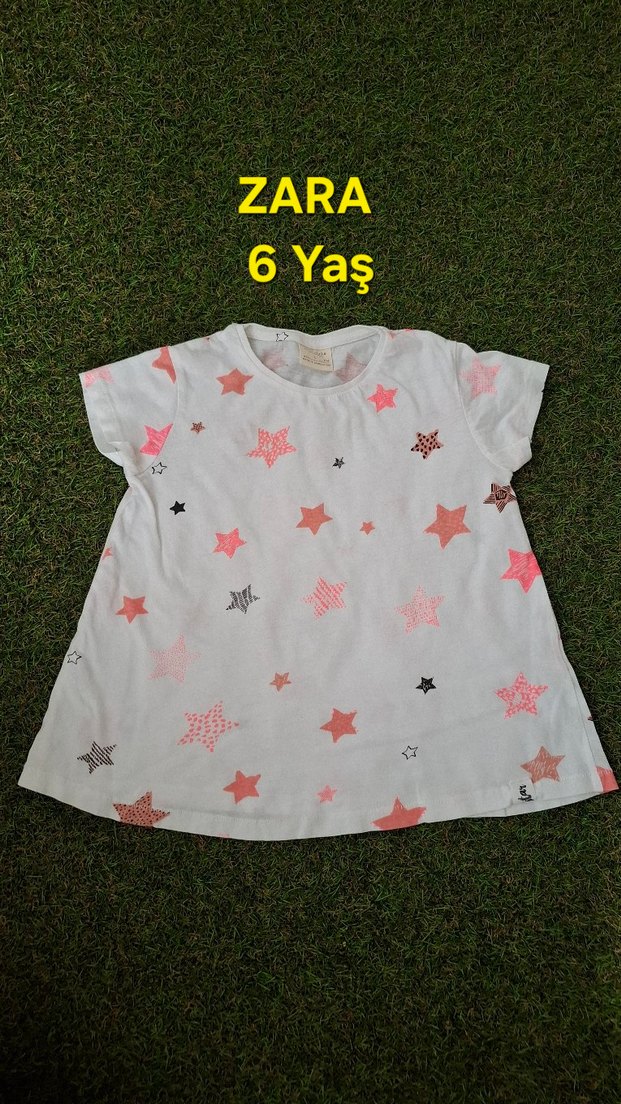 Zara marka, rahat kesim, yuvarlak yakalı kısa kollu kız çocuk tshirt.Pastel renklerde yıldız baskılı. Yeni ayarında tertemizdir( soyulma, renk solmasi bulunmuyor. yıldızların orjinali böyle)