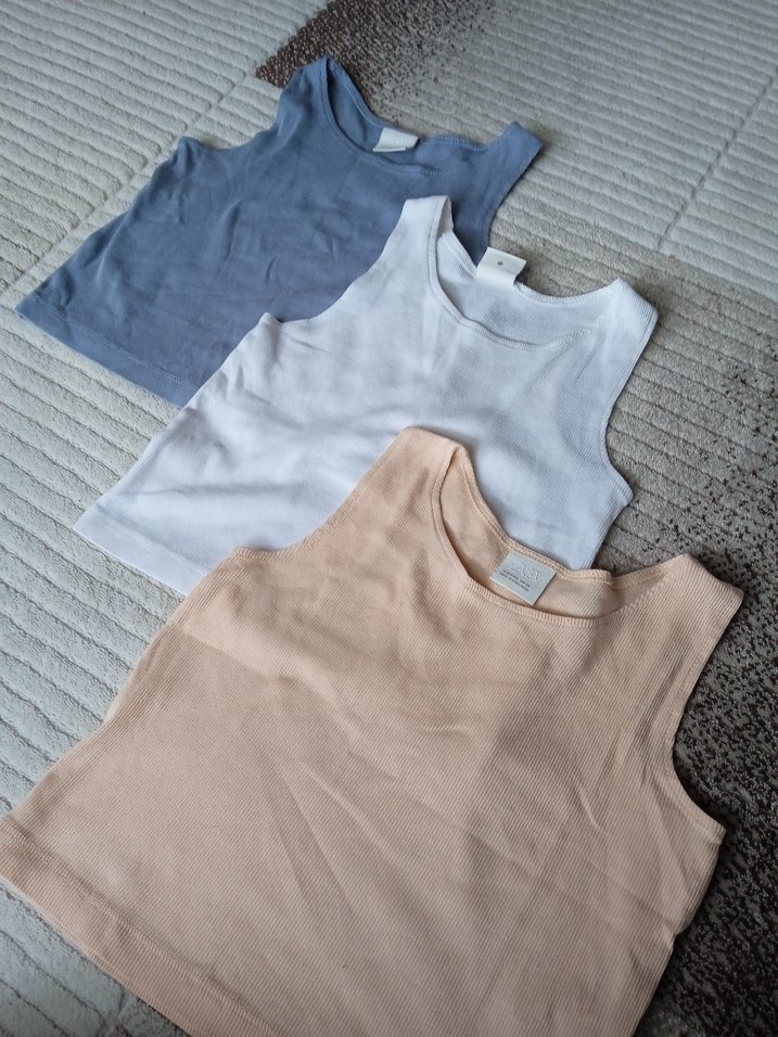 Bej, açık mavi ve beyaz renklerde çocuklar için pastel tonlarda kolsuz atlet seti. Yumuşak kumaştan üretilmiştir. zara 9-10 yaş krop üçlü fiyat tekli de satilir