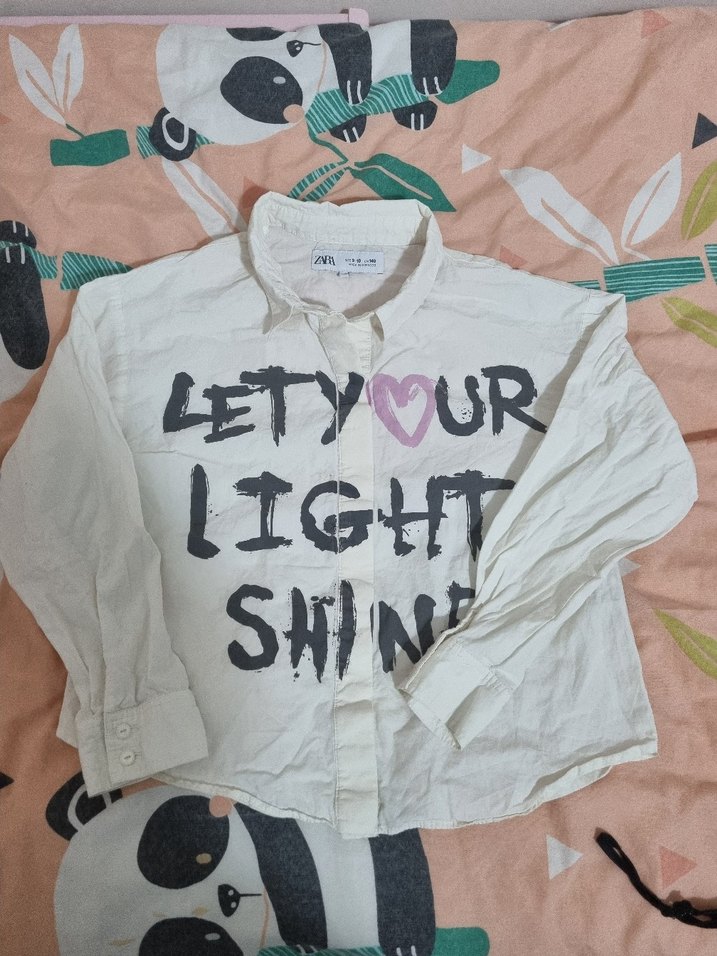 Beyaz pamuklu gömlek, uzun kollu ve bol kesimdir. Yaka düğmeli ve "LET YOUR LIGHT SHINE" baskılıdır. Trendy sokak giyimi için uygundur.