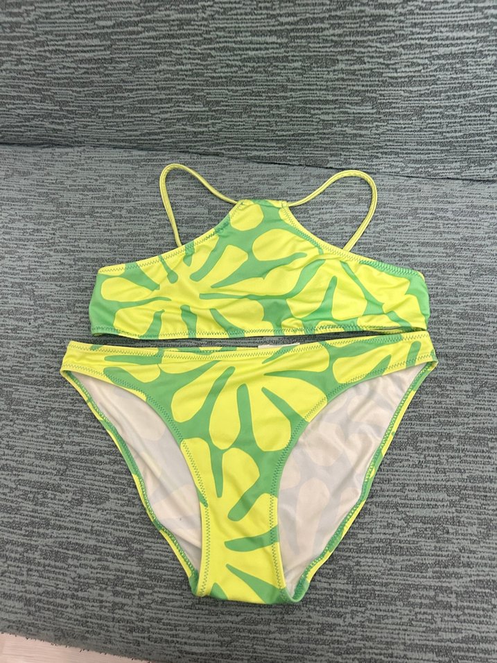 Sarı bağlamalı askılı, renkli tie-dye desenli, dantel detaylı, mini uzunlukta, sıkı oturan çocuk bikini takımı.ürün sayılı temiz kullanıldı beden küçük olduğu için satıştadır.