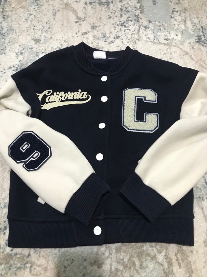 Düğmeli, yuvarlak yakalı, baskılı desenli ve bol kesim erkek çocuk Zara kolej ceket.