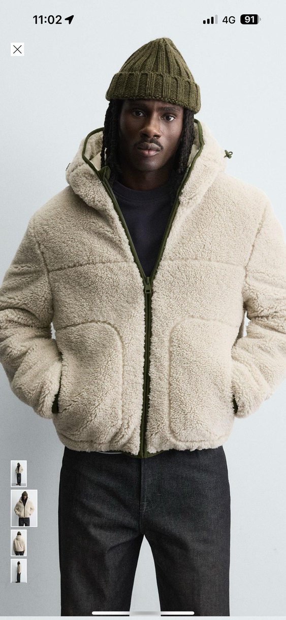 Bej renkli, yüksek yakalı ve uzun kollu erkek mont, yumuşak ve sıcak kumaştan, kürk detaylıdır. Orta boy ve rahat kesimle trend bir casual stil sunar.