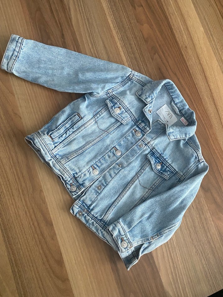 Düğmeli, kesik yakalı, bol kesim pastel mavi kız çocuk denim ceket, rahat ve şık bir sokak stili sunar Sadece en üst çıtçıtlı yok başka da hiçbir sıkıntısı yoktur yırtık leke hiçbir şey yoktur
