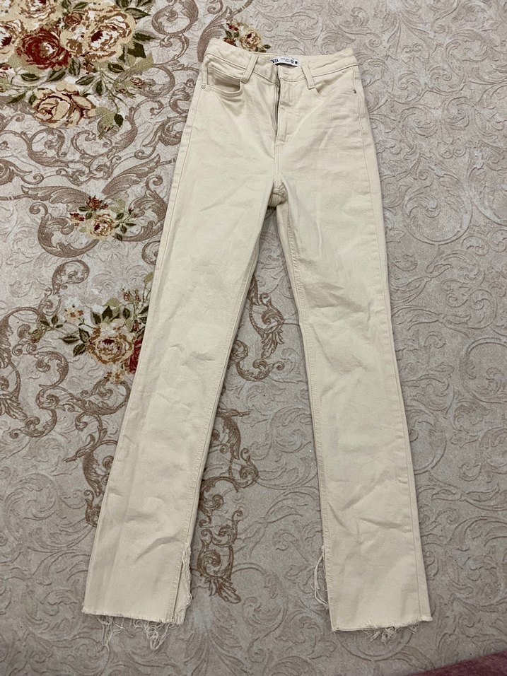 Beyaz pamuklu kot pantolon, normal kesim ve midi boyda, yırtmaç detaylı sade tasarım, gündelik kullanım için uygundur.
