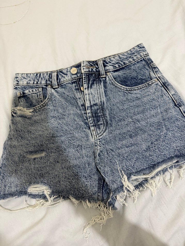 Gri batik desenli, yıpranmış detaylı ve püsküllü kenarlı salaş mini denim şort, rahat sokak stili için uygun.