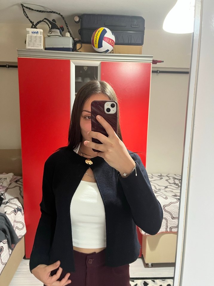 Ürün koyu lacivert dokuma model Zara hırkadır etiketlidir hiç giyilmedi broş detayı ile şıklık katıyor