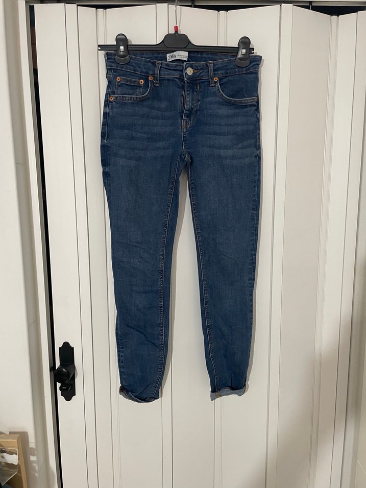 Zara marka koyu mavi baskılı denim kadın jean, fitted kesim ve fermuarlı detaylarla günlük rahat kullanıma uygun.