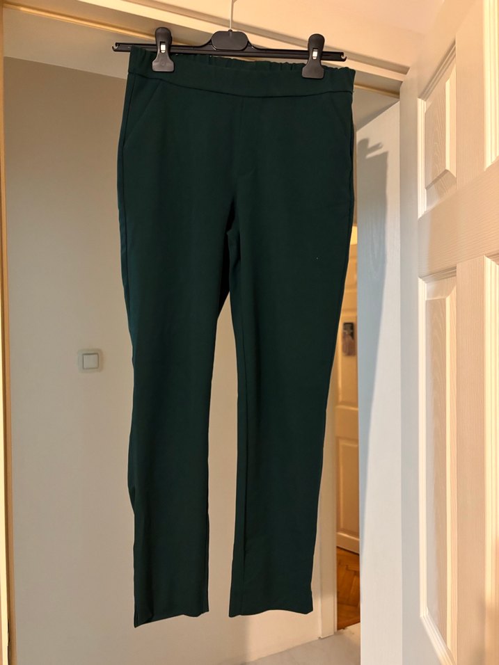 Zara’dan aldım, ama etiketi rahatsız ettiği için kestim. Koyu yeşil, düz renk, normal boy midi kesim, sentetik kumaştan, rahat kesim kadın pantolon. Ofis için trend ve şık bir tercih. #zara