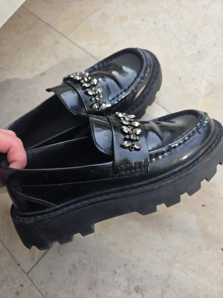 Zara Koz Çocuk Siyah Parlak Yılan Desenli Platform Loafer 34