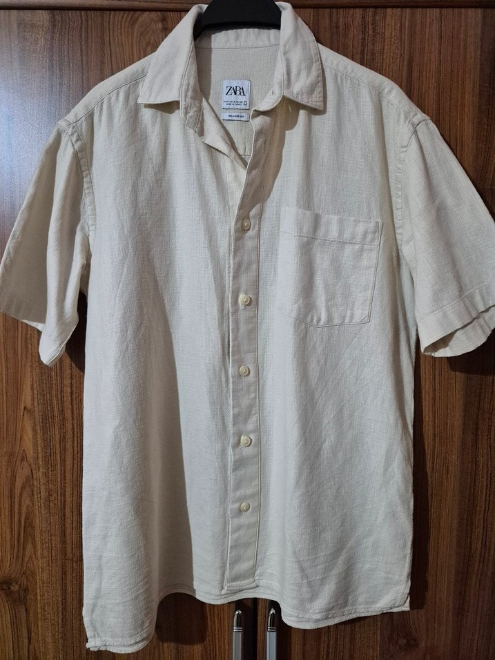 ZARA erkek gömlek, yakalı, kısa kollu ve düğmeli. Yumuşak kumaştan, normal midi boyda, rahat kesim. Krem rengi günlük sokak stili için uygun.