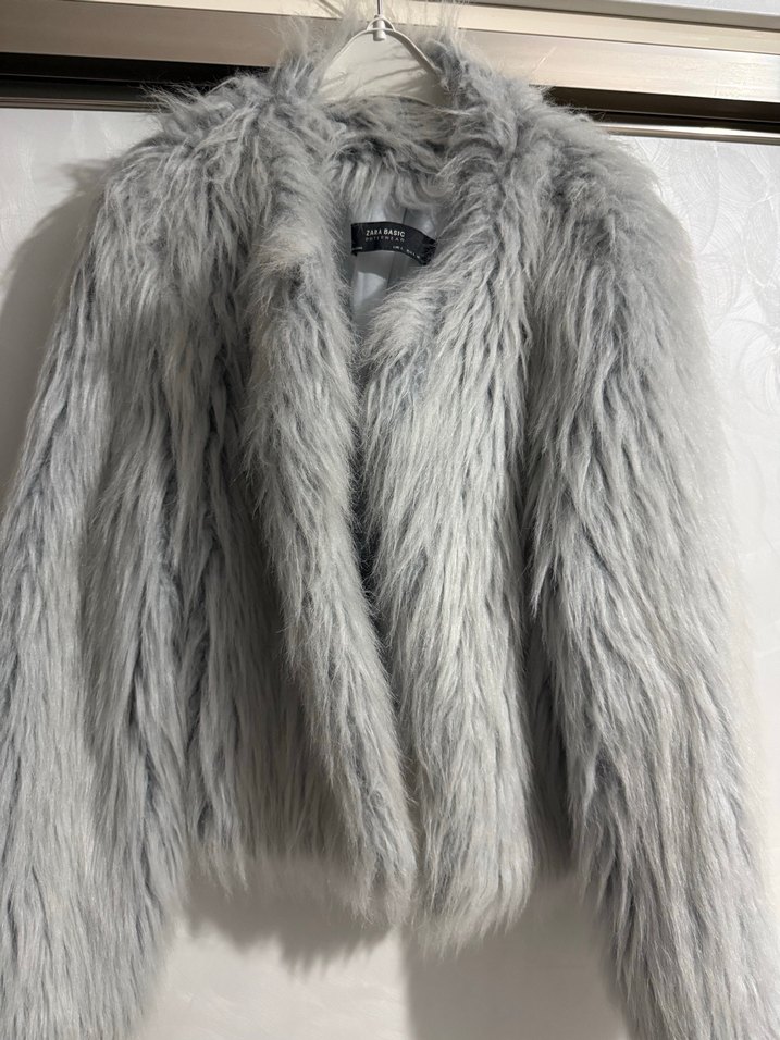 Bu fitted midi ceket, uzun kollu ve yakası kesilmiş, yumuşak sentetik kumaştan ve detaylı suni kürkten yapılmıştır, rahat bir streetwear görünümü sunar. Rengi bebek mavisi/gri arası. L beden