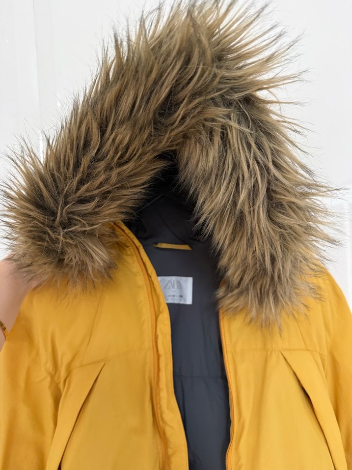 Sarı, çıkarılabilir kürk detaylı, yakalı ve uzun kollu, yumuşacık şişme mont. Tertemizdir. Sadece kolunda minik bir yırtık var. montlar için yapışkanlı su geçirmez etiketlerden yapıştırıp çok rahat kullanabilirsiniz.