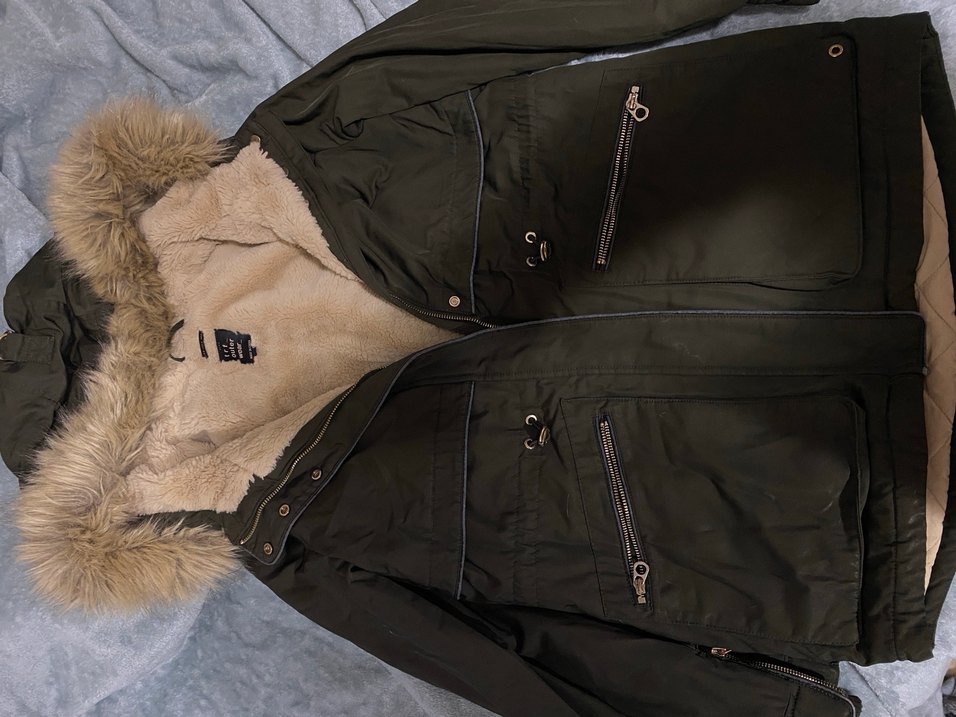 Zara Asker yeşili, içi kürklü detaylı, uzun kollu, normal midi boyda, fermuarlı cepli, rahat kesim kadın mont. Dışı su geçirmez ve kapüşonlu. Sokak modasına uygun ve konforlu bir tasarım. Herhangi bir kusuru yok, fazlalık olduğu için satıyorum.