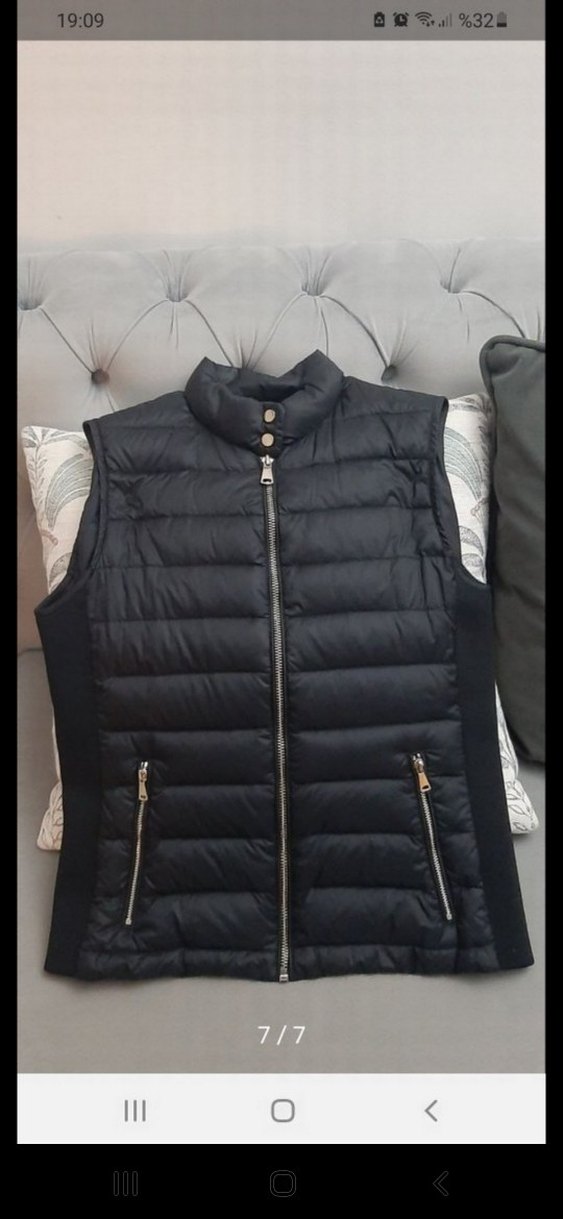 Orjinal Zara Kuş tüyü. Siyah, fermuarlı, yüksek yakalı, sentetik kumaştan yapılmış, dar kesim kadın şişme yelek. Rahat ve şık sokak tarzı için uygundur.