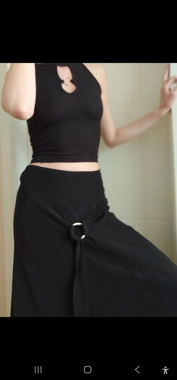 Siyah, uzun ve drapeli tasarıma sahip, yumuşak ve ipeksi kumaştan üretilmiş bol kesim etek. Gotik ve şık ofis stiline uygundur.
