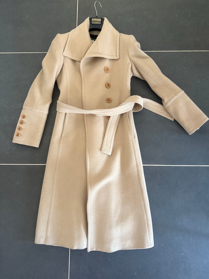 Bej renkli, kuşaklı ve düğmeli kadın kabanı. Geniş yaka ve kol uçlarında düğme detayları bulunur. Diz boyu, yumuşak ve sıcak kumaş. Sag omuzda minicik yerde bi incelme var fotografını ekledim.