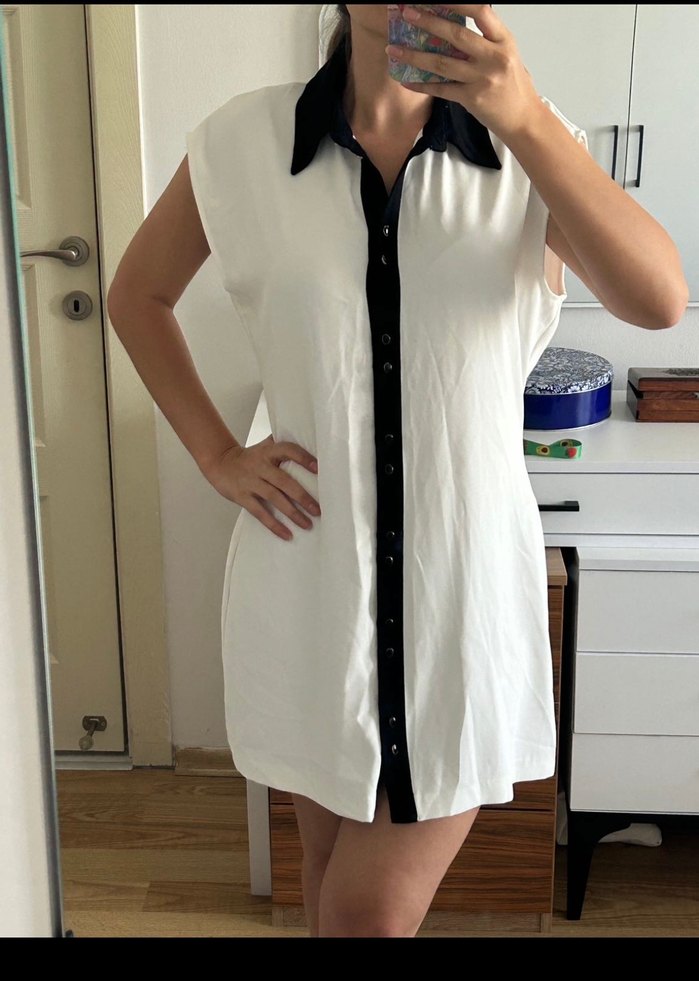 Zara L Düğmeli Siyah Yakalı Beyaz Kadın Gömlek Elbise