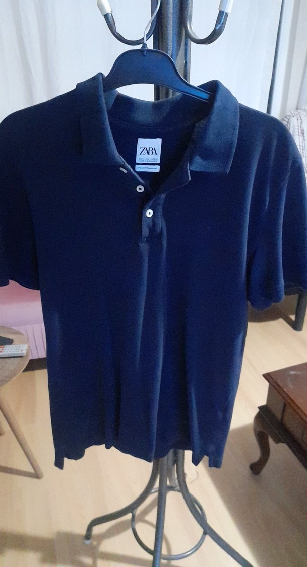 Zara lacivert denim polo tişört, kısa kollu ve yakalıdır. Rahat kesimiyle gündelik şıklık sunar.