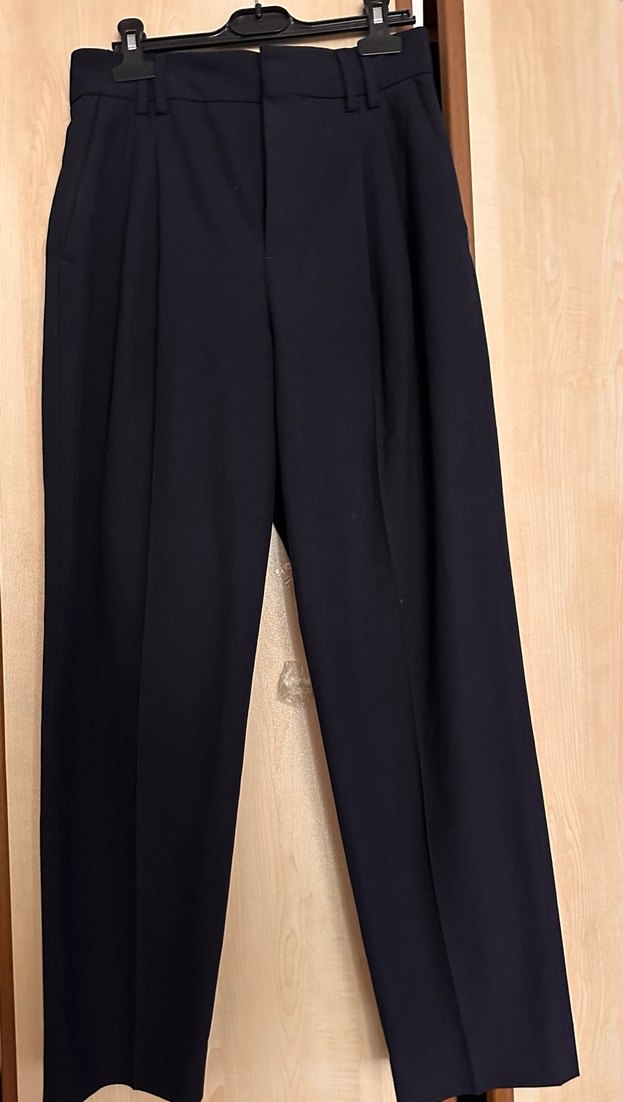 Kadınlar için lacivert kumaştan, regular fit ve uzun boyda pilili pantolon. Ofis için klasik ve zarif görünüm sunan, ipeksi dokulu, desen içermeyen koyu renkli pantolon.uzunluğu 95cm.