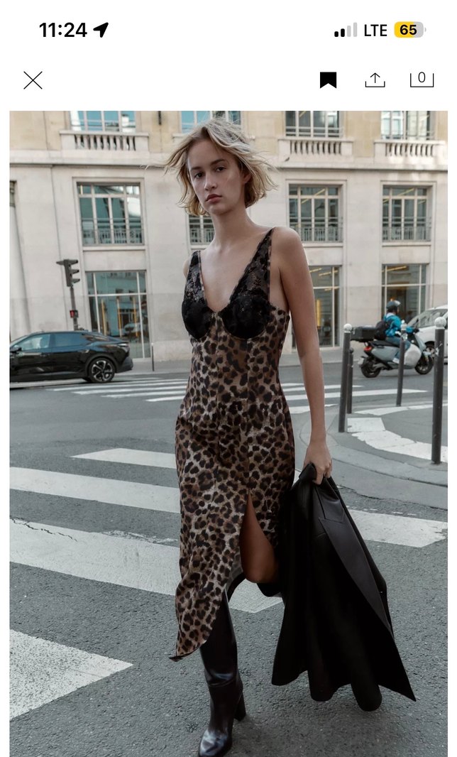 Kahverengi leopar desenli, deri kumaştan, V yakalı ve askılı uzun elbise. Kürk detaylı ve yan yırtmaçlıdır.