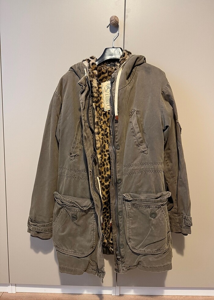 Sıcacık tutan tam bir kışlık parka. İçindeki leopar kısmı ayrılıp sadece yağmurluk gibi olabiliyor. Fotoğraftaki gibi. Hiçbir deformasyonu yoktur. Bedeni Xs ama S beden için uyumlu. Kalıbı geniş.
