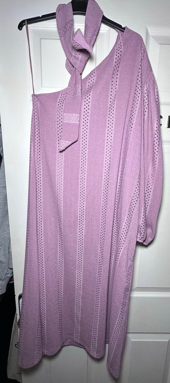 Bol kesim, tek kol yumuşak sentetik kumaştan, pastel lila renkte, vintage bohem tarzında. Üstündeki aksesuar koldaydı fakat ben fular olarak kullanırım diye çıkardım. Ama hiç giymedim. Astar kullanılabilir