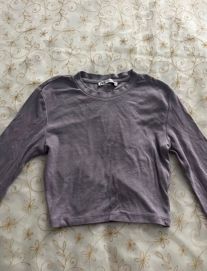 lila renkli, uzun kollu ve yuvarlak yakalı bluz, yumuşak kumaştan, rahat ve şık bir görünüm sunar.