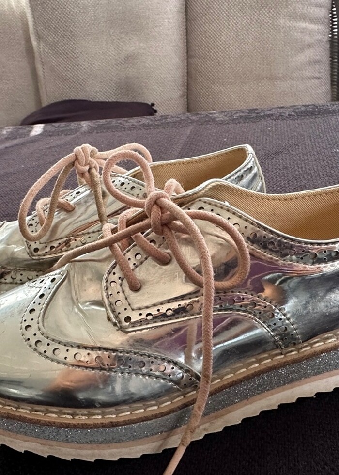 32 Numara rugan, gümüş rengi Zara kız çocuk loafer.