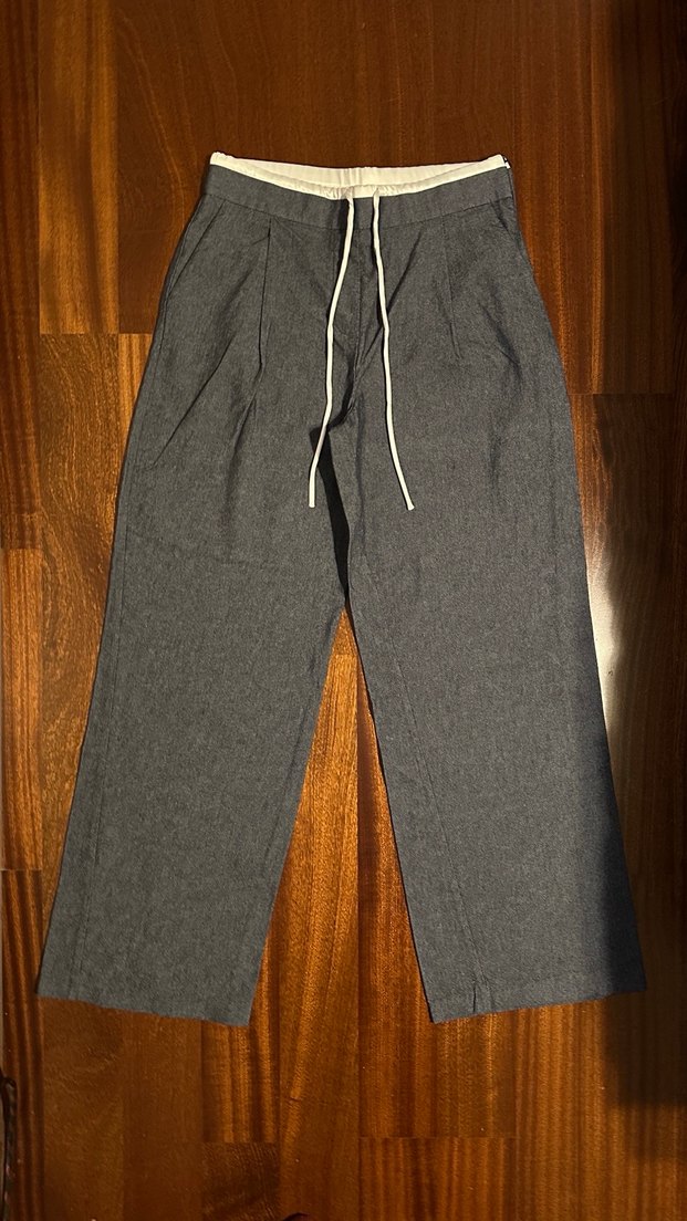 Çift Bel detaylı, düşük bel, bağcıklı, geniş kesim gri kadın kumaş pantolon.