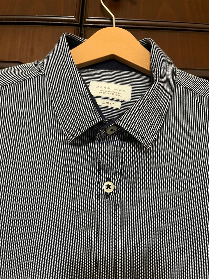 Zara Man erkek gömlek, yakalı ve düğmeli. Pamuklu, regular fit, kısa kollu, çizgili koyu gri desende, ofis ve günlük kullanım için uygundur. İki koltuk altı arası eni 52 cm boy 74 cm