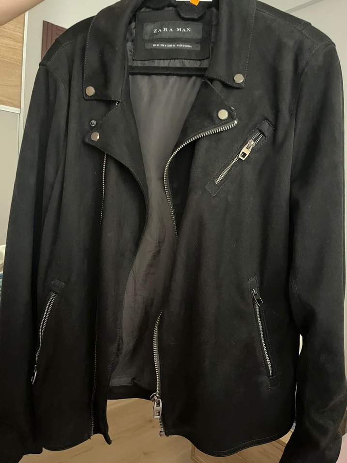Zara Man siyah süet biker ceket, çıtçıtlı yaka ve fermuarlı ceplere sahiptir. Normal midi uzunlukta, uzun kollu ve regular fit kesimdir. Deformesi,kusuru yoktur,iyi durumdadır