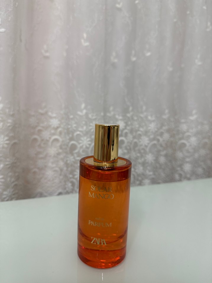 Altın kapaklı turuncu şişede Zara Mango kadın parfümü, tatlı ve ferah bir koku sunar.