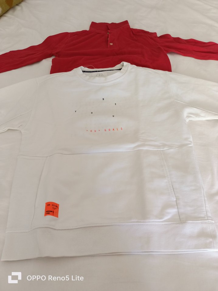 Zara marka beyaz renkli 10 yaş yuvarlak yaka pamuklu sweatshirt ve Zara marka ,10 yaş kırmızı renkli ,yakalı ve pamuklu uzun kollu ince sweatshirt