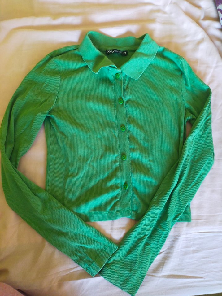 Fitted kesim, uzun kollu, düğmeli ve yakalı yeşil kadın gömleği. Yumuşak kumaştan, pastel renkte ve desensiz, günlük kullanıma uygun. crop tarzi