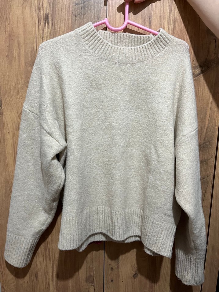 Zara marka Bej renkli, kumaştan yapılmış kadın kazak. Yuvarlak yaka ve uzun kolludur. Rahat kesimi ve normal boyuyla günlük kullanıma uygundur.
