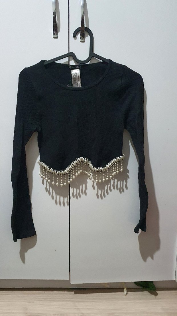 Siyah, uzun kollu, kruvaze yaka, boncuk işlemeli kısa crop top. Trendy casual ve gotik tarzlar için uygundur.