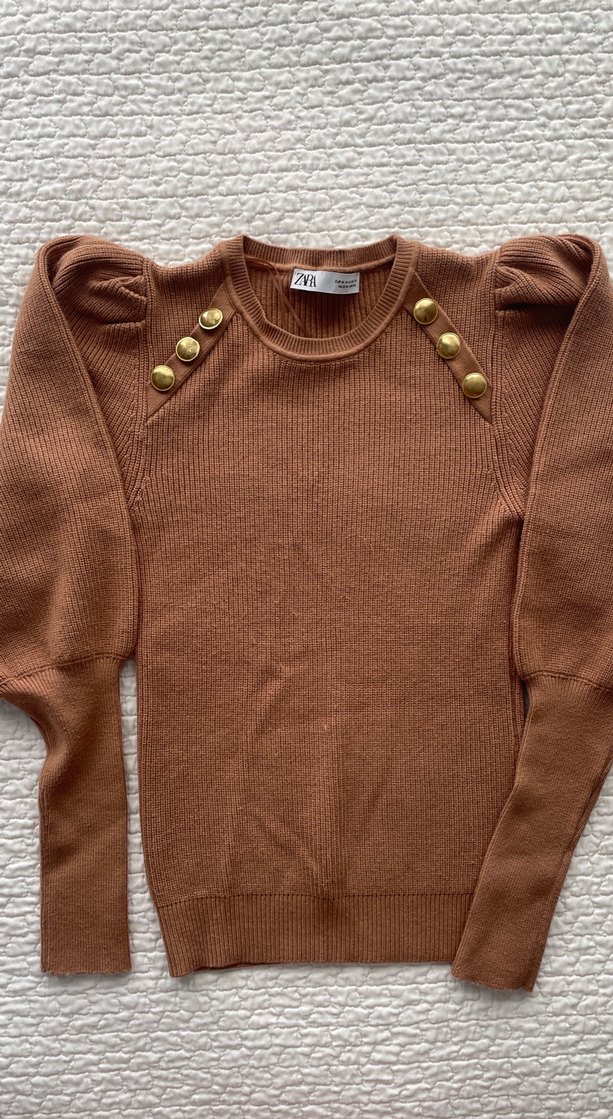 Zara marka,Bu kahverengi triko kazak, düğme detaylı omuzları ve yuvarlak yaka ile günlük kullanıma uygun rahat bir tasarıma sahiptir.