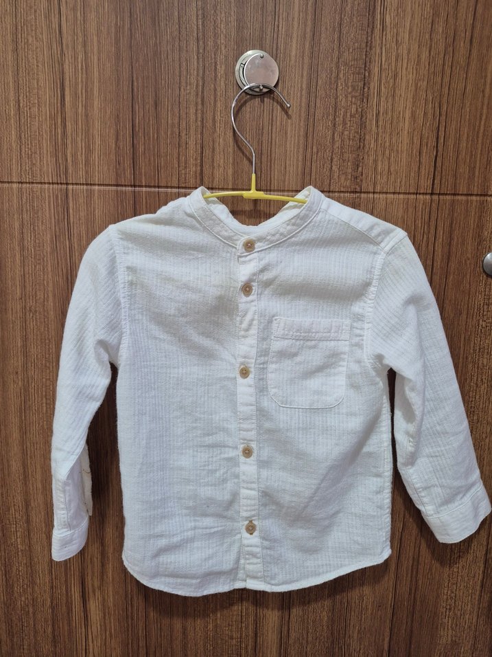 Erkek çocuklar için keten kumaştan, düğmeli,hakim yakalı ve uzun kollu beyaz gömlek. Cepli ve düz beyaz renk. boyu 40 cm iki koltuk arası 29 cm. hiçbir deformasyonu yok.