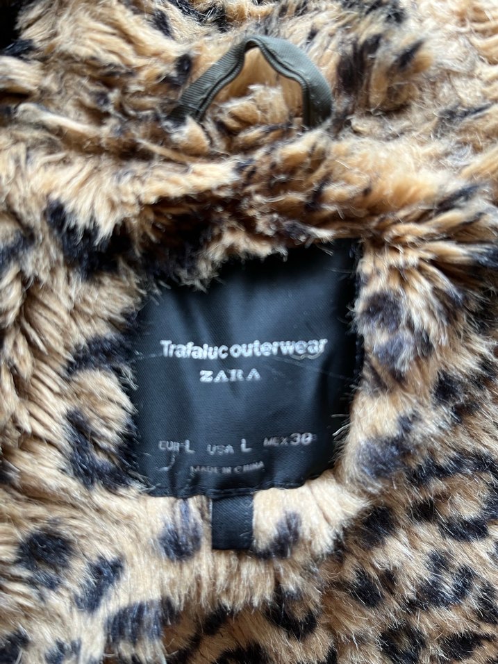 Zara marka, kapüşonlu, zebra desenli suni kürk kaban. Bol kesim ve midi boyda, dış mekan sokak stili için uygun.